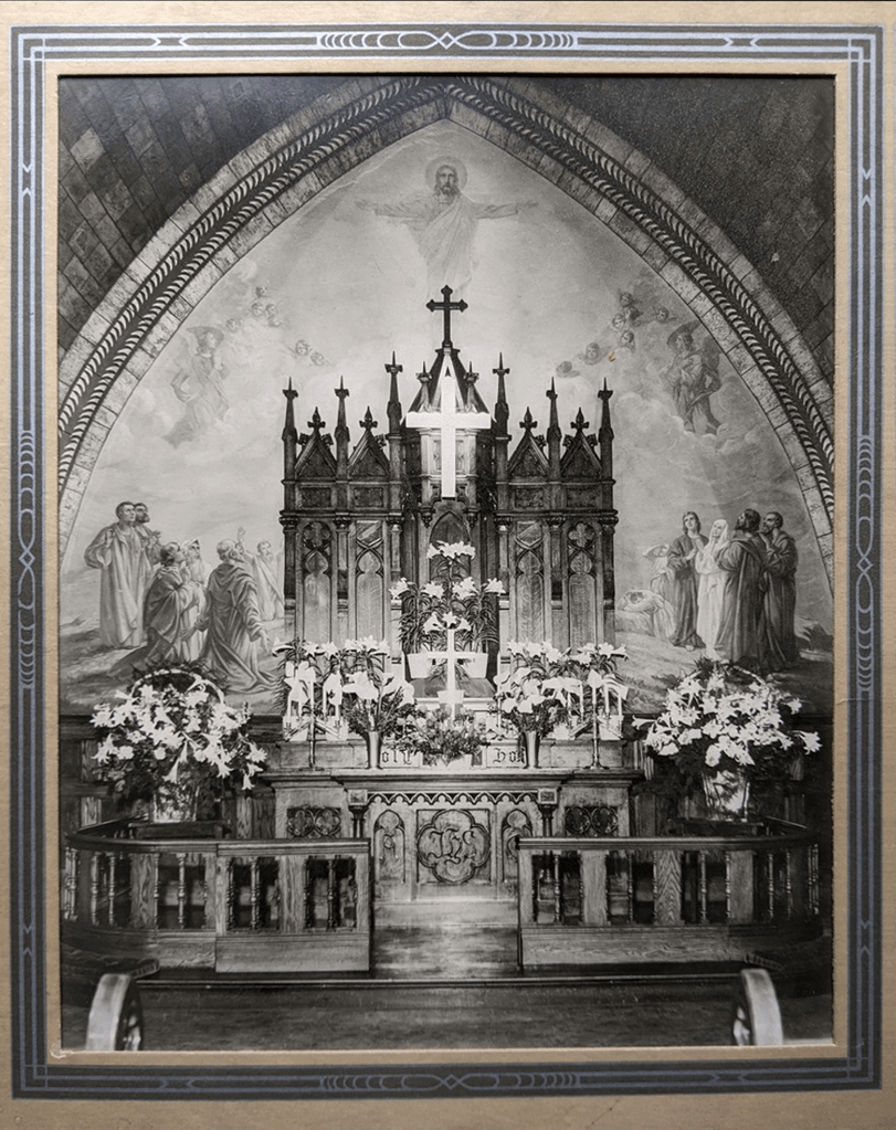 The fresco over the Good Shepherd Lutheran Church altar (above archival photograph) is a true fresco mural painting and is rare for Hudson County. Painted on wet plaster, the panorama of the Risen Christ was executed 1929-1930 by Hans Schmidt and still retains its visual immediacy and vibrancy. Courtesy of Good Shepherd Lutheran Church of Weehawken.