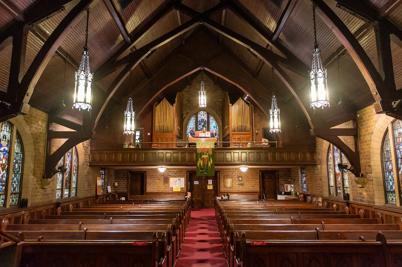 The interior of Good Shepherd Lutheran Church of Weehawken is a visual splendor, in particular the pitched void of a master-carpentered hammer beam ceiling with iron rods and plates strengthening great timber trusses, rafters, beams, braces, and brackets. Within this architectonic embrasure are visceral cycles of memorial stained-glass windows of distinct beauty.