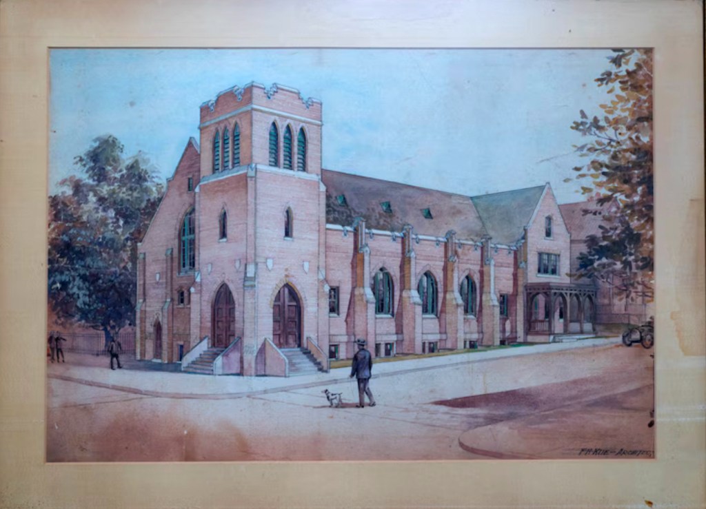 The original 1915 architect’s watercolor of Good Shepherd Lutheran Church in Weehawken. Numerous original and precious archives are kept inside the church’s parsonage building and include black and white photographs, blueprints, architectural watercolors, deeds, incorporation papers, parish texts, and parchments.
