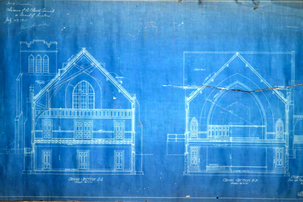 Sheet No. 9, Original Blueprint, Good Shepherd Lutheran Church, Weehawken, New Jersey (1915); Frederick Klie, Architect: Weehawken’s Good Shepherd Lutheran Church, at the northeast corner of Park Avenue and Columbia Terrace, was designed and constructed in 1915 by Hoboken architect Frederick Klie in a vernacular derivative of the English Gothic.