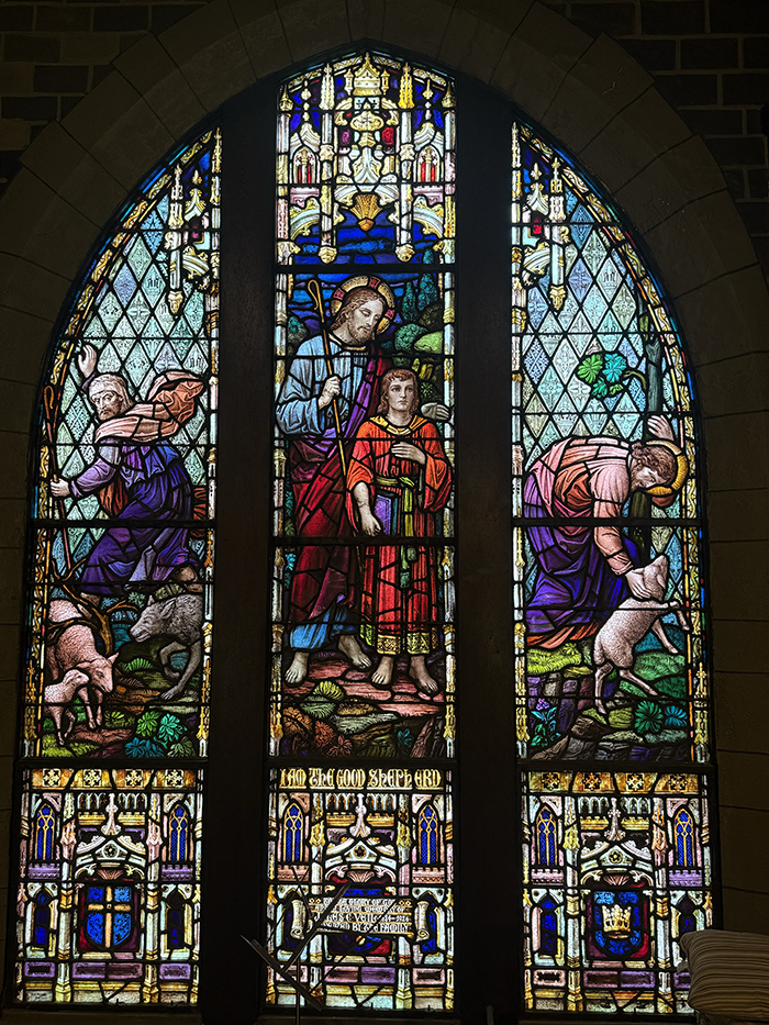 Installed in Good Shepherd Lutheran Church’s west choir loft wall, the Veil Window was executed by A.L. Brink, New York. Dedicated to Jules C. Veil (1884-1926) in 1926 by his family, this, the namesake window of the church, is undoubtedly one of Hudson County’s great stained-glass masterpieces. A glass canvas spectacle showing emotion-filled scenes from Christ’s shepherding years, the window captures the breadth of the life of Veil, an established engineer deeply involved in the church’s building campaigns and philanthropic work